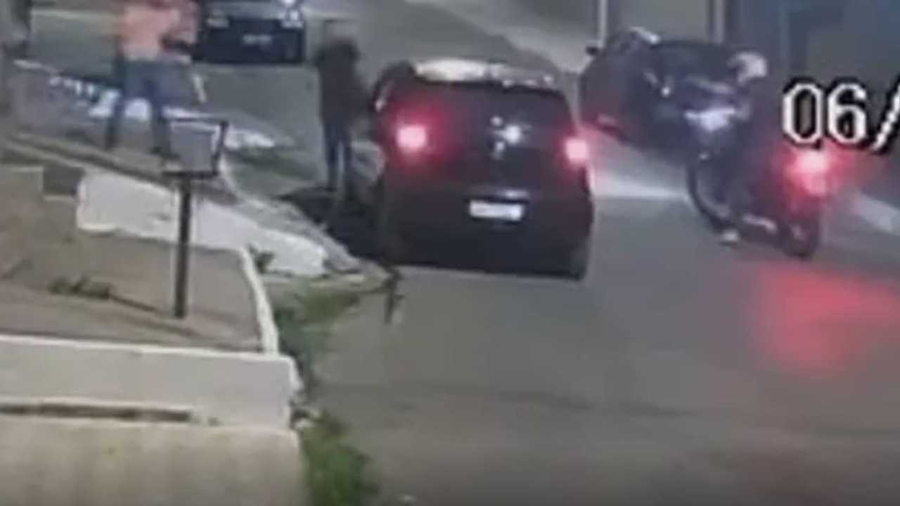 O casal de namorados estava a bordo de um veículo modelo FOX, quando foram cercados por pelo menos três motocicletas. Os ocupantes das motos atiraram diversas vezes na direção das vítimas. A mulher, ferida, permaneceu no carro.