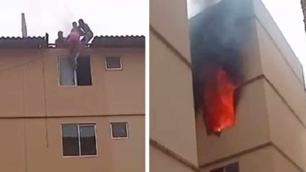 Alguns moradores retiraram parte do telhado do prédio para puxar a mulher para cima. Enquanto isso, outros vizinhos montaram uma barreira no chão com um lençol para tentar protegê-la em caso de queda. A mulher foi retirada pelo teto e passa bem.