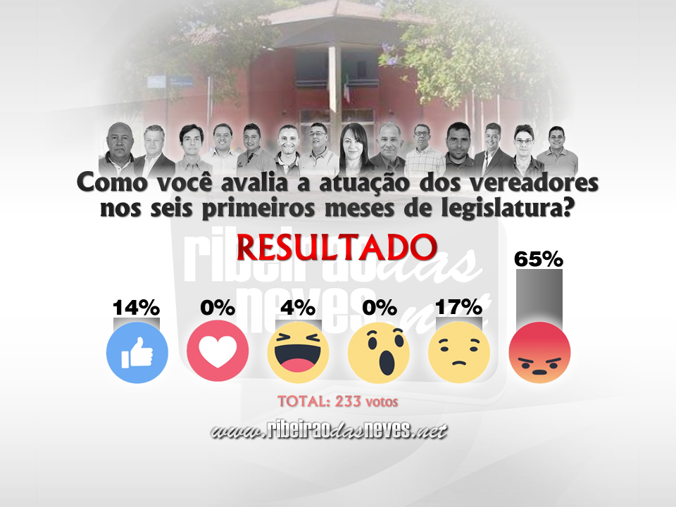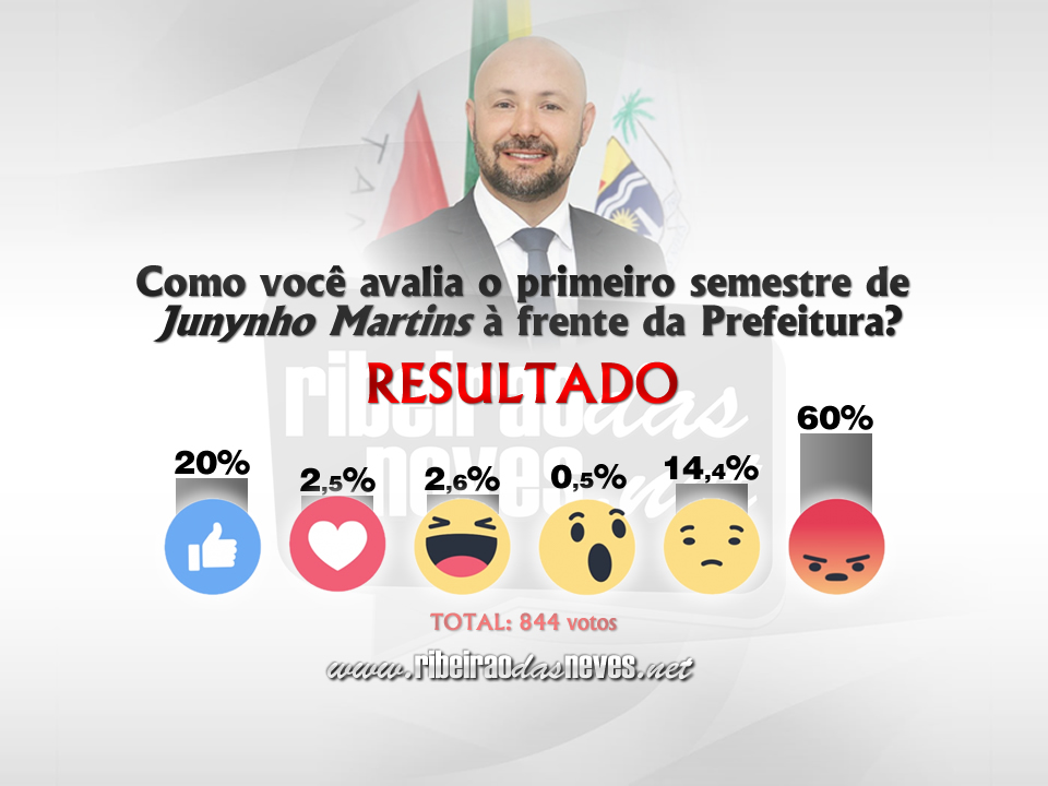 Na última sexta-feira (30), o RibeiraoDasNeves.net lançou no Facebook duas enquetes para saber da população qual a avaliação dos primeiros 6 meses de mandato do prefeito Junynho Martins (PSC) e da nova composição da Câmara de vereadores com base nos botões de reação do Facebook. Abaixo, o resultado: