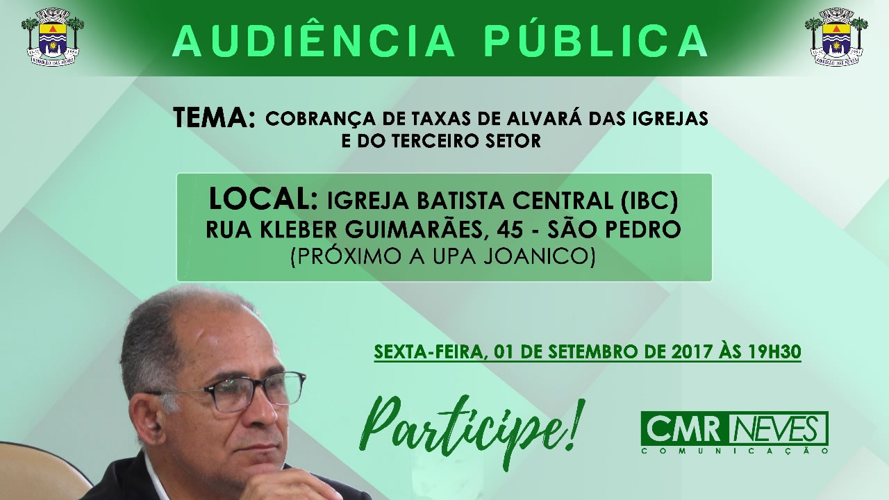 O presidente da Câmara Municipal de Ribeirão das Neves, Pastor Dario (PSC), está divulgando uma audiência pública em 1º de setembro, às 19h30, na Igreja Batista Central - próximo à UPA Joanico - para discutir a cobrança de taxas de alvará das igrejas e do terceiro setor. Segundo ele, o Executivo está querendo colocar em prática o que já está no papel desde a gestão Walace Ventura. O pastor afirmou que a Prefeitura estima uma arrecadação anual de R$ 2 milhões caso a cobrança seja feita, mas reiterou que acredita no diálogo para que o impasse seja resolvido - sem o pagamento das taxas, claro.