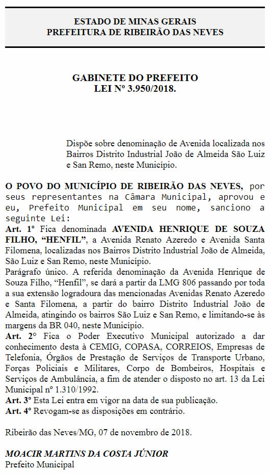 O prefeito Junynho Martins (PSC) sancionou, na semana passada, a Lei nº 3.950, que altera o nome da nova avenida que vai ligar o Centro Industrial à BR-040. A avenida Henrique de Souza Filho, "Henfil" homenageia o cartunista filho ilustre de Ribeirão das Neves. O texto está publicado no Diário Oficial dos Municípios Mineiros (DOMM) dessa terça-feira (13).