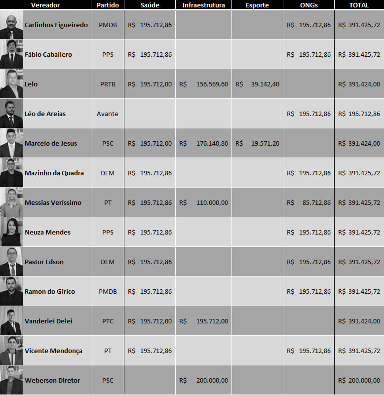 • Veja como cada vereador destinou as verbas da emenda parlamentar impositiva