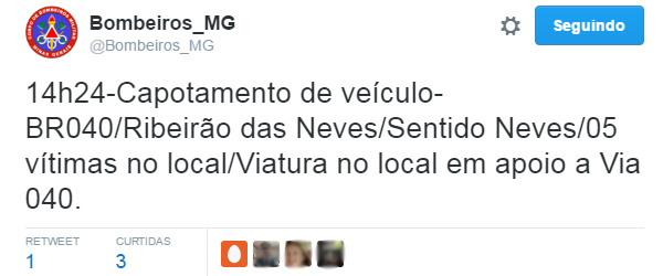 De acordo com o Corpo de Bombeiros, um carro com três homens capotou na marginal que liga a rodovia à penitenciária público-privada, altura do km 509. Com o impacto do acidente, os dois passageiros que não usavm cinto de segurança foram ejetados do veículo, sendo que um deles foi arremessado até a pista principal da BR-040. O motorista foi socorrido pelo atendimento da Via 040, concessionária que administra a rodovia, e posteriormente transferido pelo helicóptero Arcanjo dos Bombeiros com ferimentos leves.