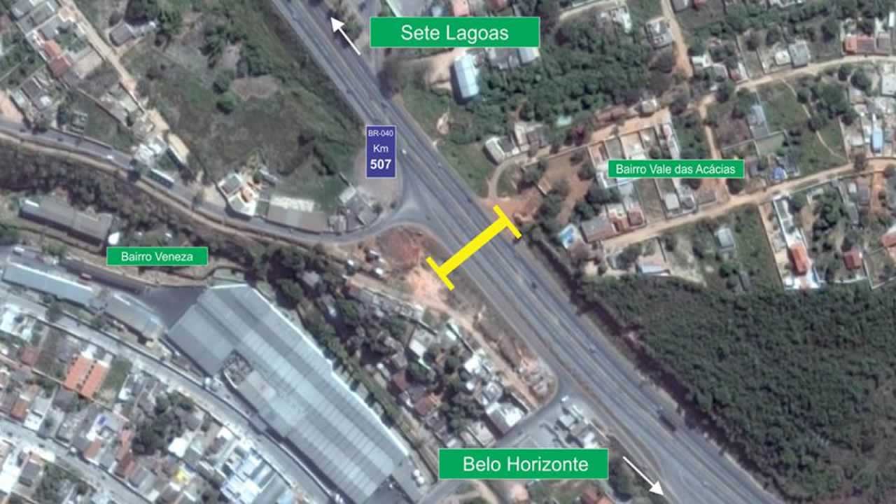 A BR-040 vai ser interditada na noite desta quarta-feira (28) para instalação de viga de travessia da passarela no bairro Veneza, altura do km 509, em frente ao Condomínio Vale do Ouro.