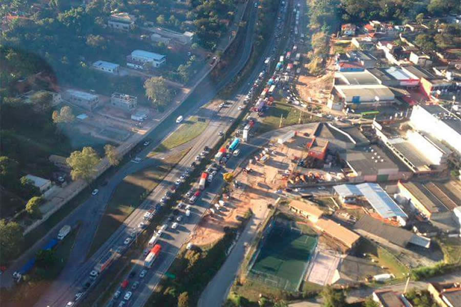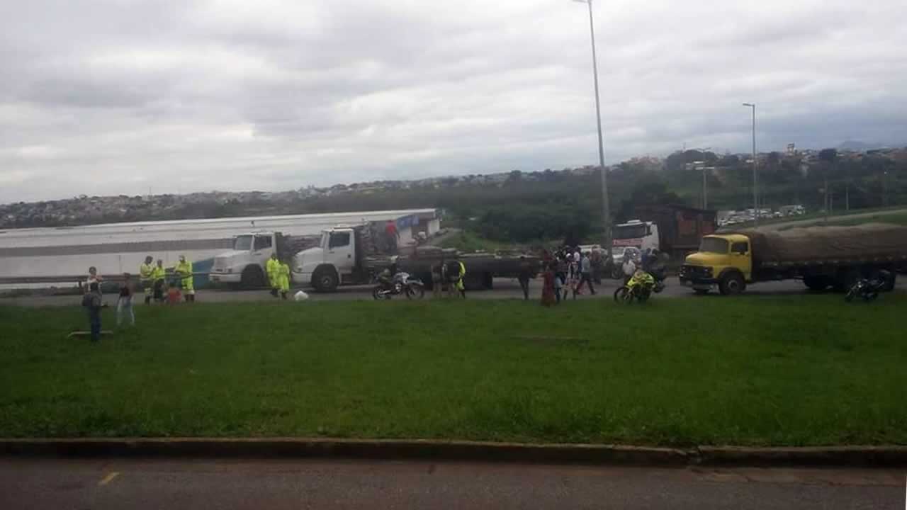 Caminhoneiros fecharam a BR-040 na manhã desta segunda-feira (21) no km 511, altura do trevo de Ribeirão das Neves. Os veículos pesados estavam sendo parados e uma faixa foi interditada, causando retenção de 5 km, segundo a Via 040.