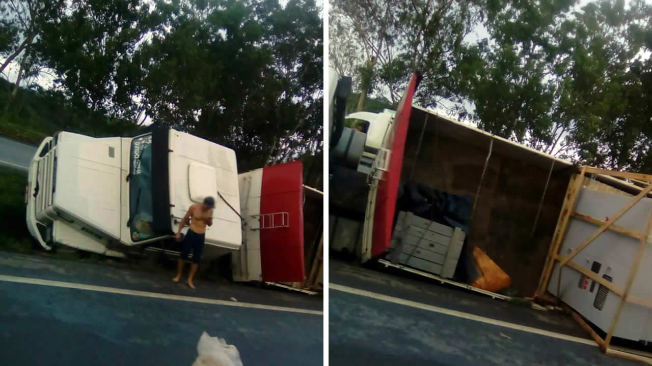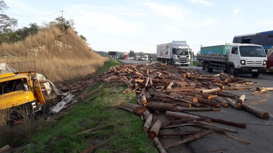 O caminhão estava carregado de madeiras, que ficaram espalhadas pela rodovia.