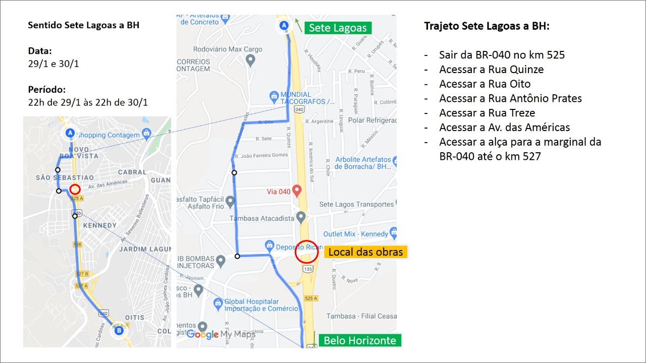 Motoristas que passam pela BR-040 na altura do município de Contagem devem ficar atentos. Trechos da rodovia serão interditados para obras no viaduto Teleférico, na altura do acesso aos bairros Morada Nova e Água Branca. A previsão é de que a obra dure até o próximo sábado (19).