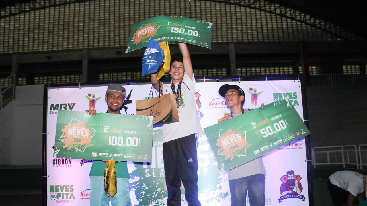 Na categoria iniciante, o pódio foi formado por dois atletas da instituição, Kennedy Martins (1º) e Paulo Henrique (3º), ambos moradores da cidade que começaram a praticar o slackline esse ano com o professor Alisson Ferreira - Campeão Mundial. O carioca Lucas Souza que ficou com a segunda posição.