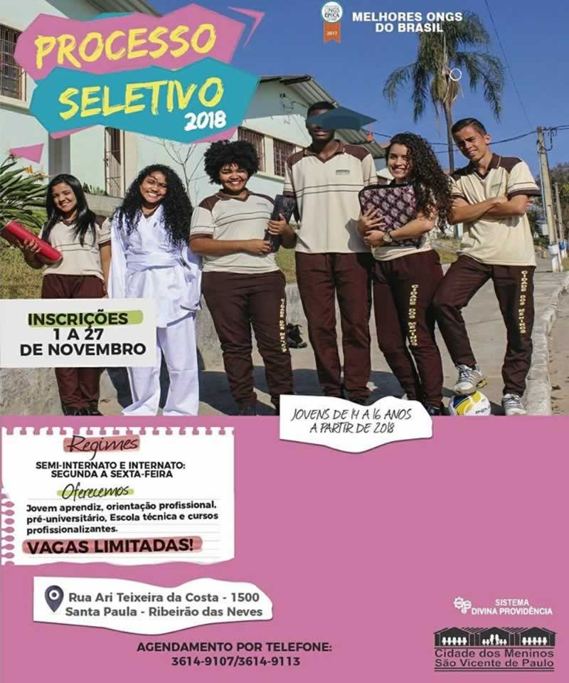 A Cidade dos Meninos abre, de 1º a 27 de novembro, o processo seletivo para ingresso de alunos em 2018. As inscrições serão feitas por meio de agendamento pelos telefones (31) 3614-9107 e 3614-9113. Podem se candidatar jovens de 14 a 16 anos a partir de 2018.