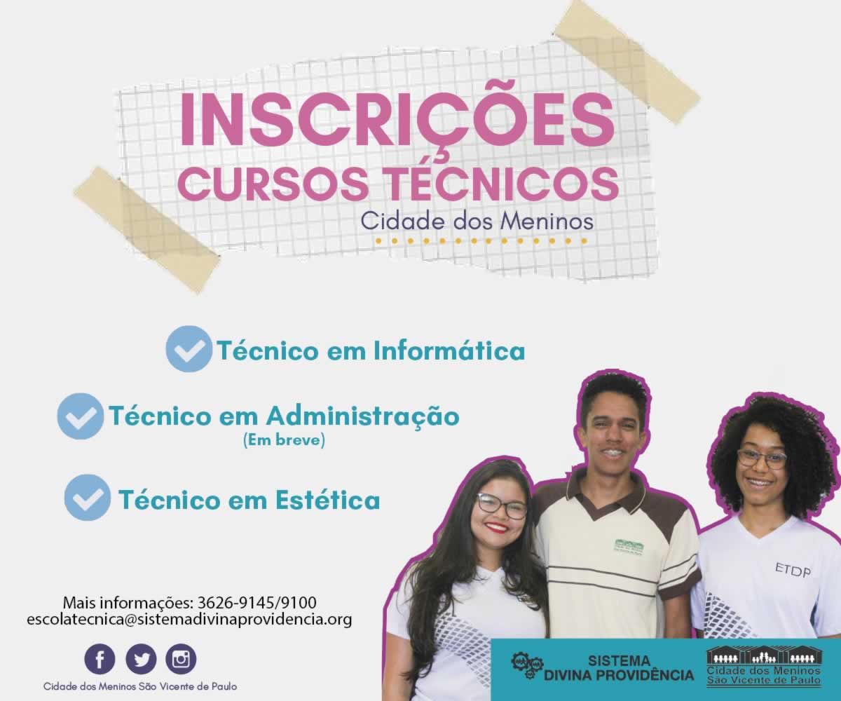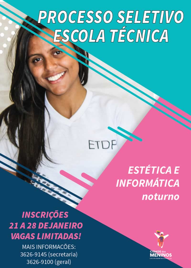 Estão abertas as inscrições dos Cursos Técnicos da Cidade dos Meninos. São oportunidades para se capacitar em Técnico em informática e a novidade Técnico em Estética. A instituição também abre em breve as vagas para o curso de Técnico em Administração.