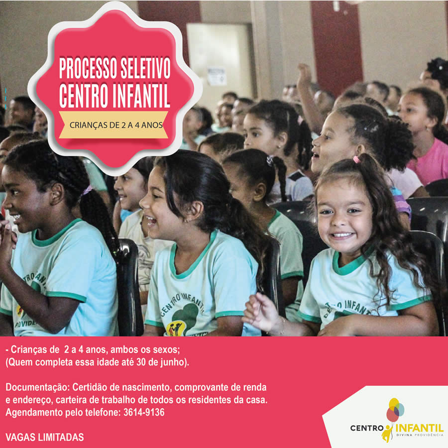 Para entrada na creche, as vagas são para crianças de 2, 4, 5, 1º e 4º ano do fundamental. O cadastro será feito pela internet em link disponível no site da instituição sistemadivinaprovidencia.org, mais informações no telefone da unidade (31) 3614-9136 e WhatsApp (31) 9 8634-0725.