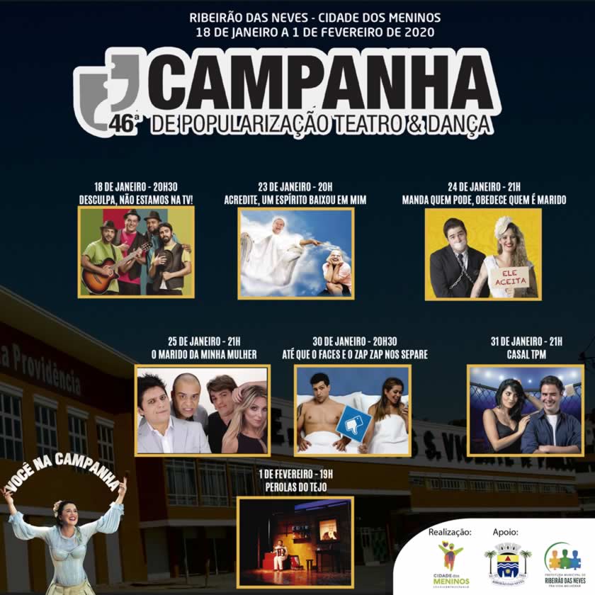 A tradicional Campanha de Popularização do Teatro e da Dança, que já faz parte da programação de férias em Belo Horizonte, chega a seu segundo ano em Ribeirão das Neves. Nessa edição, a Cidade dos Meninos vai receber sete peças adultas entre os dias 18 de janeiro e 1º de fevereiro de 2020.