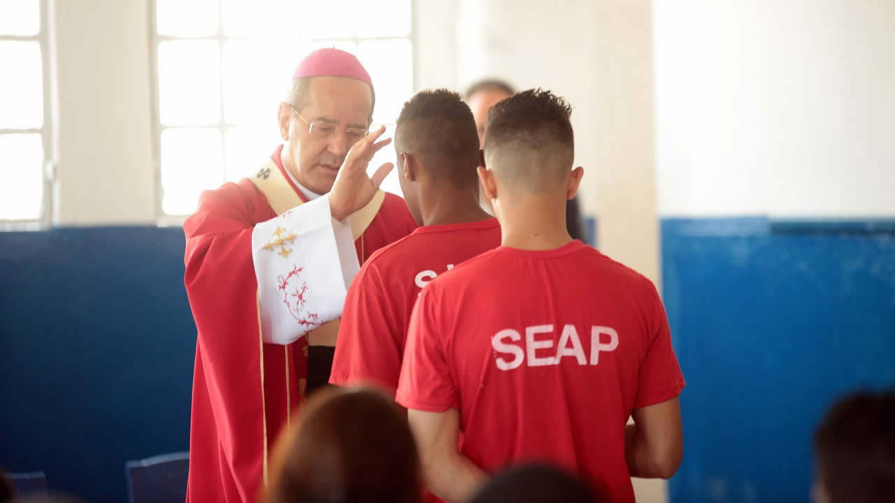 Detentos da penitenciária José Maria Alkimin, em Ribeirão das Neves, viveram momentos de partilha e oração durante a visita de dom Walmor Oliveira de Azevedo na manhã desta terça-feira (19). O Arcebispo presidiu Celebração Eucarística em Ação de Graças pelos cinco anos de reconstrução da Capela São Dimas, que fica dentro do presídio.