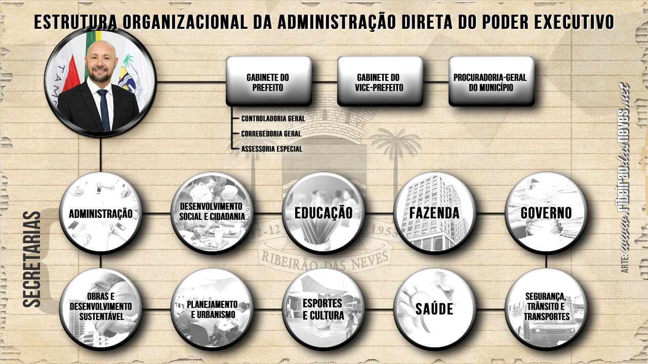 A Lei Delegada Nº 02/2017 dispõe sobre a estrutura organizacional da administração direta do poder executivo, fixando em 10 o número de secretarias municipais, sendo elas: Administração; Desenvolvimento Social e Cidadania; Educação; Fazenda; Governo; Obras e Desenvolvimento Sustentável; Planejamento e Urbanismo; Esportes e Cultura; Saúde; e Segurança, Trânsito e Transportes. Integram ainda a Administração Direta o Gabinete do Prefeito, que é integrado por Controladoria Geral, Corregedoria Geral e Assessoria Especial; Gabinete do Vice-Prefeito; e Procuradoria-Geral do Município.