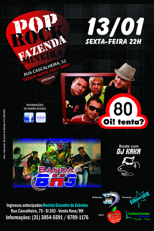 A próxima sexta-feira 13 não terá nada de assustador. Muito antes pelo contrário. É que a Banda Oi!Tenta?, do vocalista Bruno Coimbra, morador do bairro Santa Marta, se apresenta no Fazenda Mineira, em Venda Nova, cantando o melhor do Rock Nacional dos anos 80.