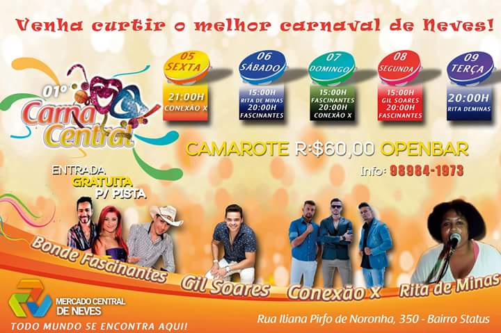 O Mercado Central de Neves divulgou, nesta terça-feira (2), a programação especial de Carnaval, o 1º Carna Central, que vai de sexta (5) até terça (9). A entrada é gratuita para pista e R$ 60 para camarote open bar.