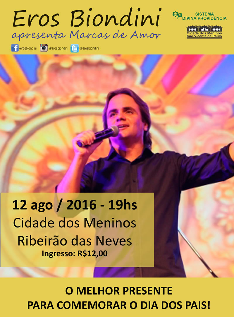 O cantor Eros Biondini apresenta, no dia 12 de agosto, antevéspera do Dia dos Pais, às 19h, na Cidade dos Meninos, seu show "Marcas de Amor". Os ingressos para o evento serão vendidos a R$ 12 na própria insituição.