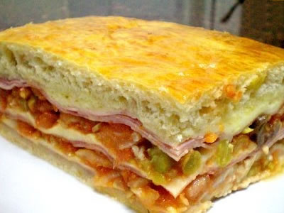 - Uma camada de mussarela, uma camada de presunto, uma da mistura de todos os demais ingredientes do recheio