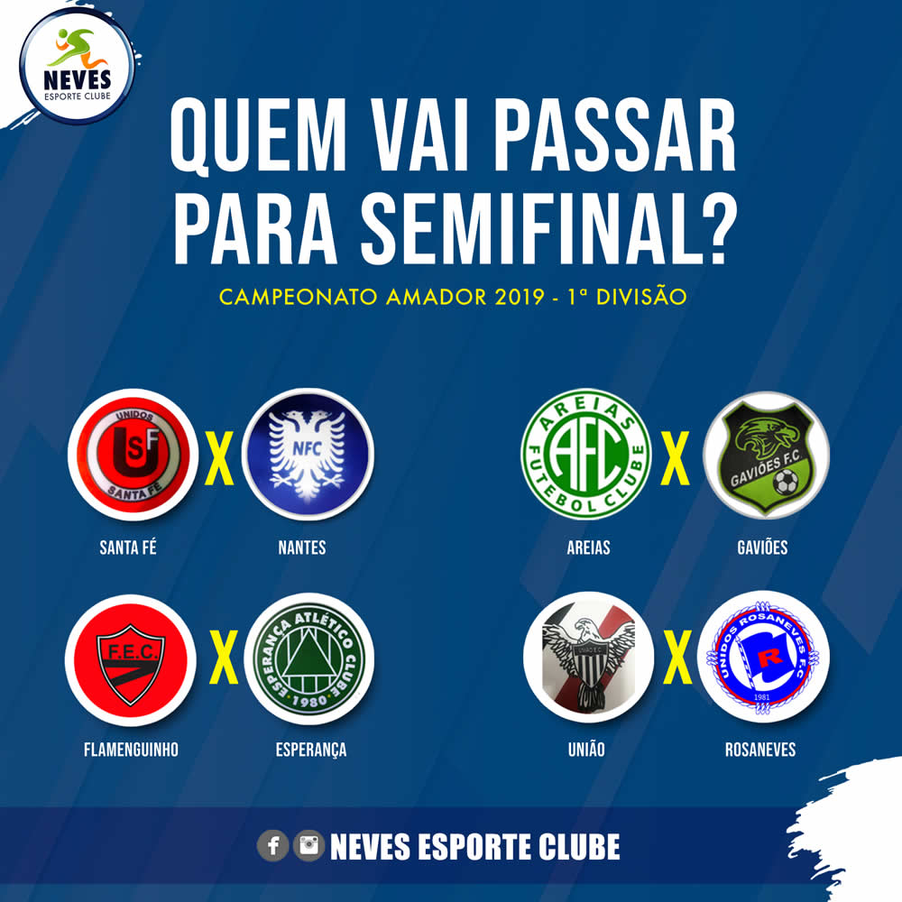 Agora, as equipes classificadas se enfrentam, em jogo único, neste domingo (1º), às 10h, para decidir uma vaga nas semi-finais. Santa Fé x Nantes jogam no campo Parque Esportivo Jardim Primavera. Areias x Gaviões duelam no Estádio Municipal Ailton de Oliveira. União x Rosaneves medem forças no campo Conjunto Henrique Sapori. Já Flamengo x Esperança fazem o jogo no campo do Clube Minas Gerais.