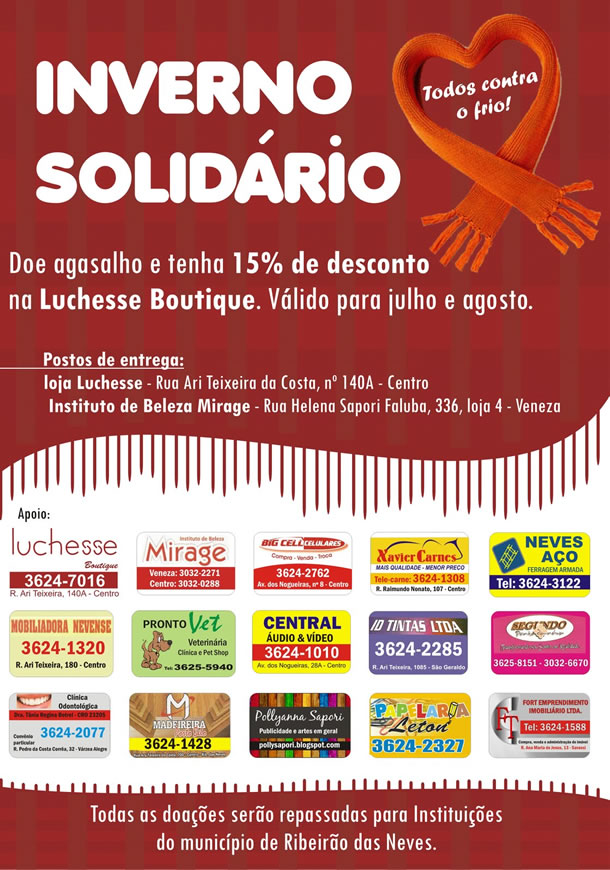 Os postos de entrega dos vestuários de frio poderão ser feitos na própria Luchesse Boutique (R. Ari Teixeira da Costa, 140A, centro) e no Instituto de Beleza Mirage (R. Helena Sapori Faluba, 336 - LJ 4, b. Veneza).