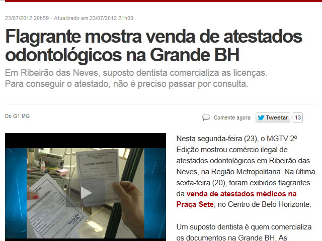 Um reportagem do MGTV 2ª Edição, da TV Globo Minas, mostrou Nesta segunda-feira (23) o comércio ilegal de atestados odontológicos em Ribeirão das Neves. Na última sexta-feira (20), o telejoranal já havia exibido flagrantes da venda de atestados médicos na Praça Sete, no Centro de Belo Horizonte.