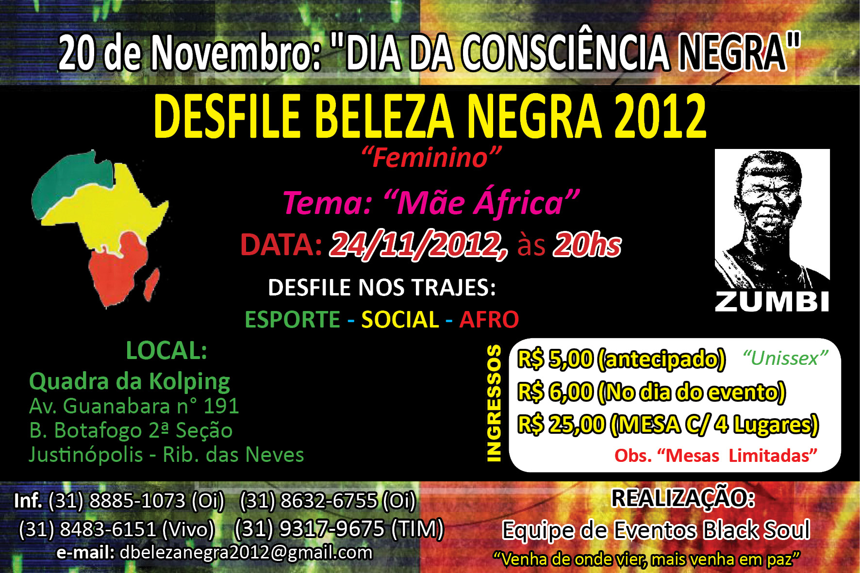 Ainda no sábado, às 20hs, na Quadra da Kolping, no bairro Botafogo, em Justinópolis, acontece o Desfile da Beleza Negra 2012, em homenagem ao Dia da Consciência Negra, comemorado em 20 de Novembro. O tema será "Mãe África" e terá desfiles nos trajes esporte, social e afro. A realização do desfile é da equipe de eventos Black Soul.