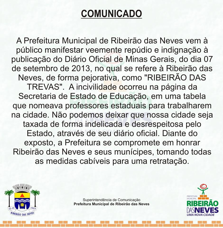 "Lamentamos profundamente o erro cometido na edição de 7 de setembro do jornal Minas Gerais. Apresentamos nossas desculpas aos mineiros, leitores do diário oficial do Estado, mas especialmente aos munícipes de Ribeirão das Neves. Reiteramos o nosso respeito por este importante polo de desenvolvimento da Região Metropolitana de Belo Horizonte e destacamos a relevância que Ribeirão das Neves tem para Minas".