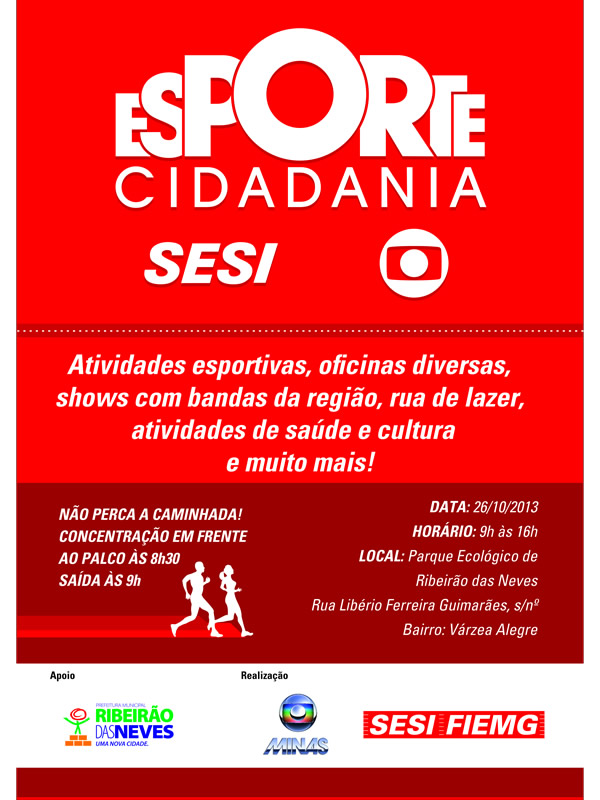 O Sesi, em parceria com a Rede Globo e a Prefeitura de Ribeirão das Neves, realizará a 9ª edição do Programa Esporte Cidadania neste sábado (26), de 9hs às 16hs, no Parque Ecológico. Neste dia, o evento será simultâneo em todas as capitais do Brasil com o objetivo de promover atividades esportivas visando à inclusão e integração social, em âmbito nacional.