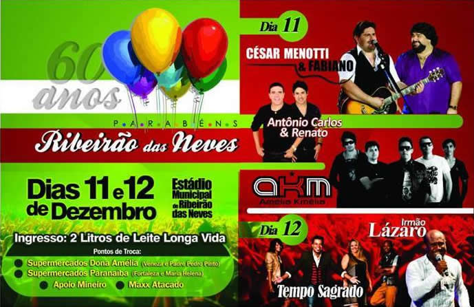 A Prefeitura de Ribeirão das Neves prepara para os dias 11 e 12 de Dezembro, no Estádio Municipal, uma grande festa para comemorar os 60 anos de emancipação do município. Na quarta-feira (11), haverá três shows principais com a dupla "César Menotti e Fabiano", os sertanejos "Antônio Carlos e Renato", e a banda "Amélia Kmélia". Na quinta (12), apresentam-se o cantor "Irmão Lázaro" e a banda "Tempo Sagrado".