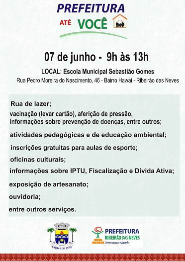 A Prefeitura de Ribeirão das Neves promove, neste sábado (26), das 9hs às 13hs, na Escola Municipal Sebastião Gomes, no bairro Hawai, região de Justinópolis, a segunda edição do projeto "Prefeitura Até Você".