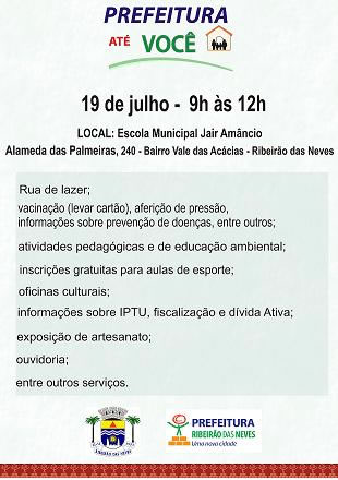 A Prefeitura de Ribeirão das Neves promove, neste sábado (19), das 9hs às 13hs, na Escola Municipal Jair Amâncio, no Vale das Acácias, região do Veneza, a terceira edição do projeto "Prefeitura Até Você".