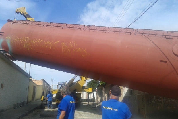 A caixa d’água é para ser instalada em um condomínio que está sendo construído na rua Alda Salomão Rezende. A pedido de uma construtora. Até o momento, a empresa de transportes não teria como retirar o objeto do local.