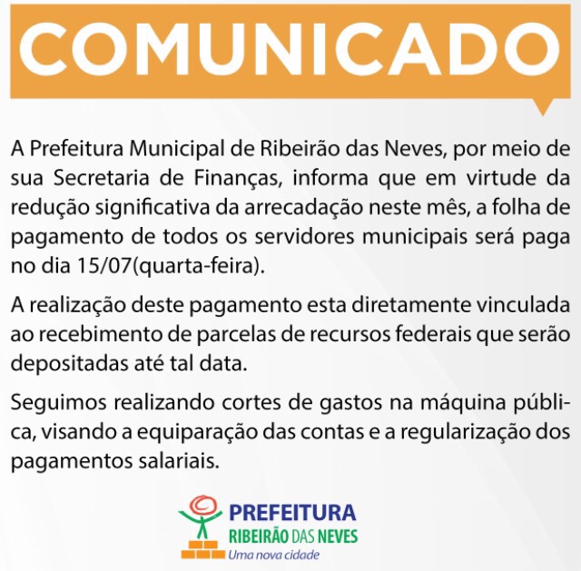 A Prefeitura de Ribeirão das Neves divulgou, nesta quarta-feira (8), comunicado informando que a folha de pagamento dos servidores municipais será paga apenas na próxima quarta, 15 de julho, em virtude de uma redução significativa na arrecadação municipal neste mês. De acordo com o executivo, o pagamento está diretamente vinculado ao recebimento de parcelas de recursos federais que serão depositados até a data.