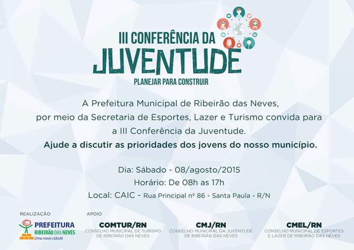 A Prefeitura de Ribeirão das Neves realiza, neste sábado (8), das 8h às 17h, no Centro de Convenções do Caic, a III Conferência Municipal da Juventude, com o objetivo de discutir as prioridades dos jovens do município.