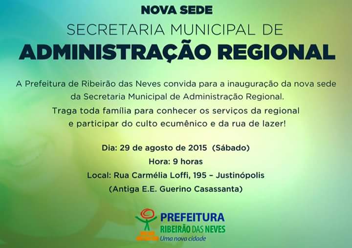 A Prefeitura de Ribeirão das Neves inaugura, neste sábado (29), a partir das 9h, a nova sede da Secretaria Municipal de Administração Regional, em Justinópolis, que será instalada na rua Carmélia Loffi, 195, na antiga Escola Estadual Guerino Casassanta.