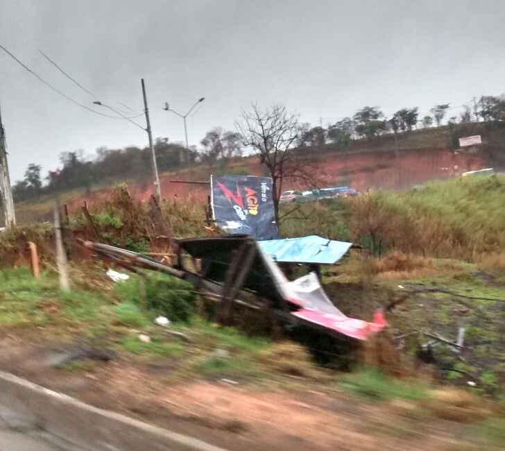 A chuva e o vento da madrugada desta quarta-feira (9) derrubaram várias placas de publicidade no trevo da BR-040, em Ribeirão das Neves, conforme registrou um internauta.