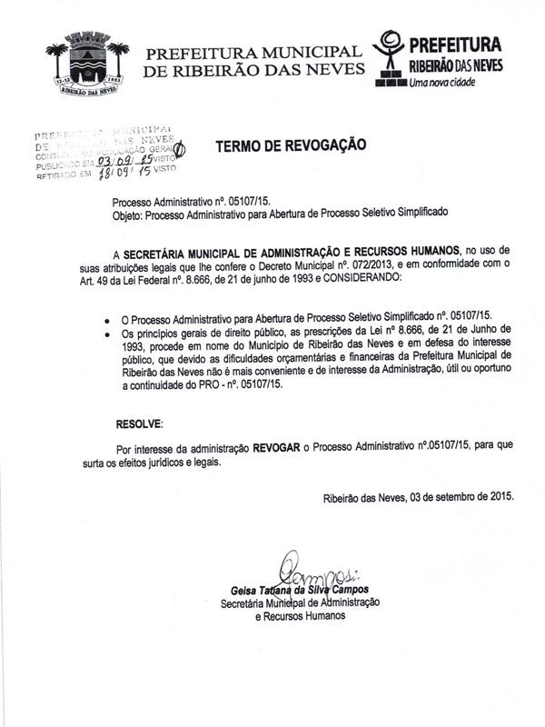 De acordo com o termo de revogação divulgado pelo executivo, "devido as dificuldades orçamentárias e financeiras da Prefeitura Municipal de Ribeirão das Neves não é mais conveniente e de interesse da Administração, útil ou oportuno a continuidade do PRO - nº. 05107/15".