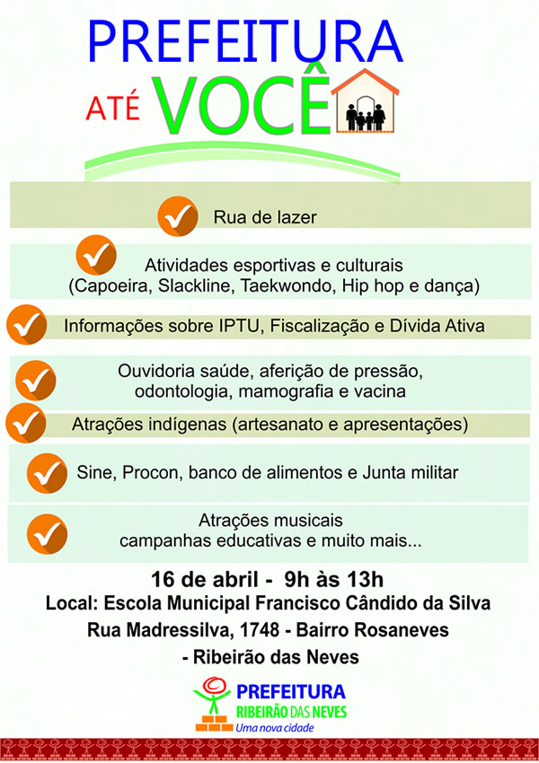 A Prefeitura de Ribeirão das Neves realiza, nesta sábado (16), de 9h às 13h, mais uma edição do "Prefeitura até Você", evento de descentralização dos serviços da administração municipal. Na oportunidade, as ações serão realizadas no bairro Rosaneves.