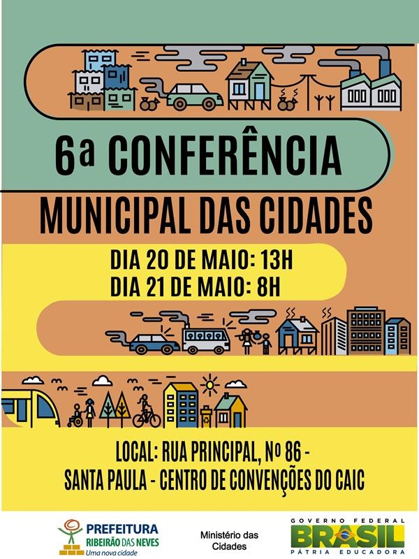 Ribeirão das Neves realizará a 6ª Etapa Municipal da Conferência das Cidades nos dias 20 e 21 de maio de 2016. O Brasil, desde a metade do século passado, deixou de ser um País rural e passou a ser uma nação intensamente urbanizada. Cerca de 160 milhões de brasileiras (os) estão vivendo nas cidades. Essa concentração da população nas áreas urbanas, sem o planejamento adequado, trouxe alguns problemas para a qualidade de vida da geração atual e comprometendo a sustentabilidade no futuro.