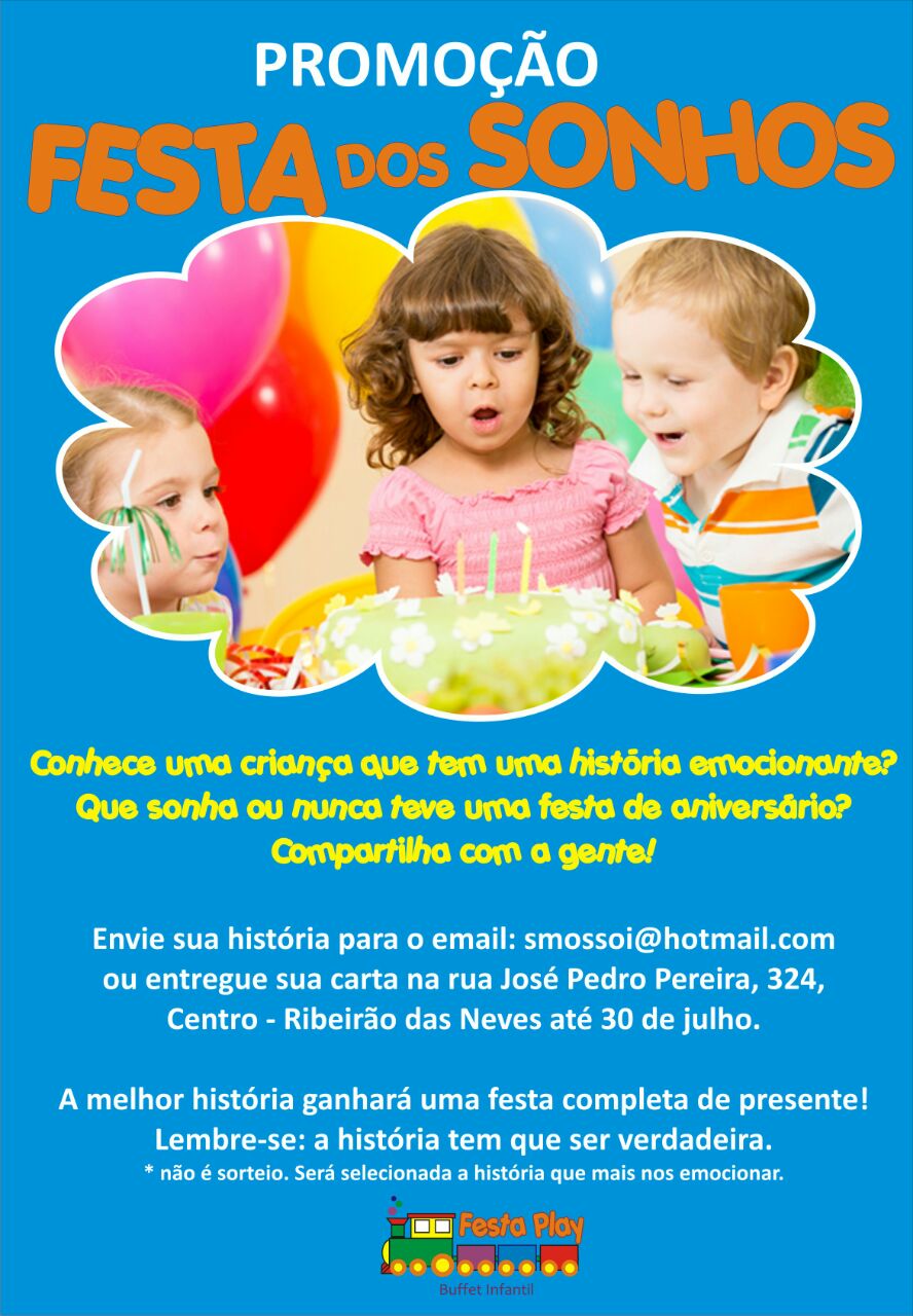 Empresários de Ribeirão das Neves se uniram para presentear uma criança que tem uma história de vida emocionante e sonha ou nunca teve uma festa de aniverário. A melhor narrativa - verdadeira - ganhará uma festa completa de presente em um buffet na cidade.