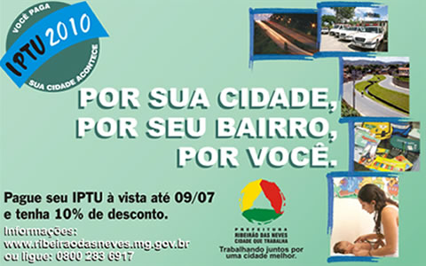 A Prefeitura de Ribeirão das Neves começou a enviar as guias para o pagamento do IPTU 2010 a partir do mês de julho. O executivo municipal oferece desconto de 10% para pagamento único até o dia 9 de julho, sexta-feira. Para informações sobre o imposto, o contribuinte pode acessar a página da prefeitura (www.ribeiraodasneves.mg.gov.br) ou ligar para 0800 283 6917.