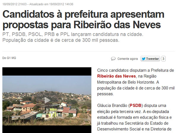 Os candidatos à Prefeitura de Ribeirão das Neves tiveram um espaço aberto na programação da TV Globo Minas para apresentar suas propostas para os eleitores que vão às urnas no dia 7 de Outubro. Quatro dos cinco nomes que pleiteam a vaga no executivo municipal participaram da reportagem para os cerca de 300 mil nevenses. Veja as falas dos candidatos nos trechos a seguir.
