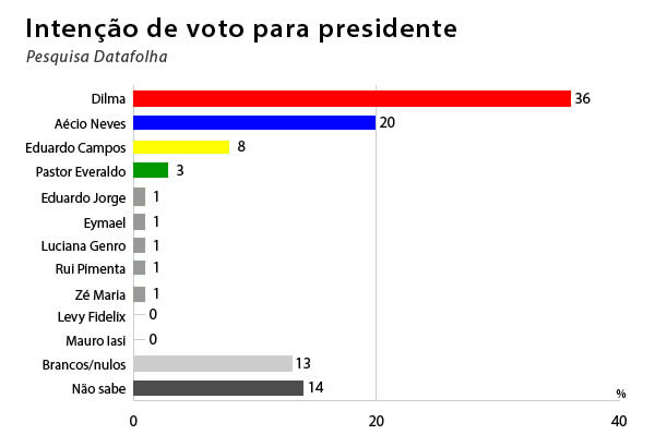 Pesquisa Datafolha, encomendada pela Folha de S.Paulo e pela TV Globo, mostra a candidata à presidência da República, Dilma Rousseff (PT) com 36% das intenções de voto, seguida pelos candidatos Aécio Neves (PSDB), com 20% e Eduardo Campos (PSB), com 8%. Mais de 5,3 mil pessoas foram entrevistadas entre os dias 15 e 16 de julho. A margem de erro é de dois pontos percentuais.