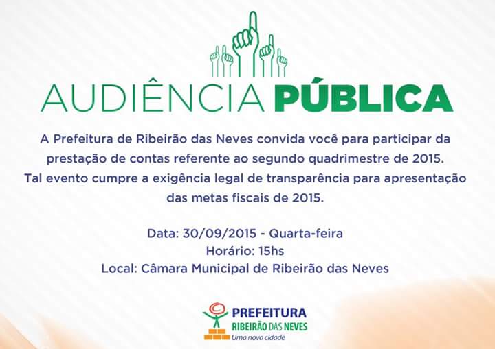 A Prefeitura de Ribeirão das Neves realiza, nesta quarta-feira (30), às 15h, na Câmara Municipal, uma Audiência Pública de prestação de contas referente ao segundo quadrimestre de 2015. O evento, segundo o executivo, cumpre a exigência legal de transparência para apresentação das metas fiscais de 1015.