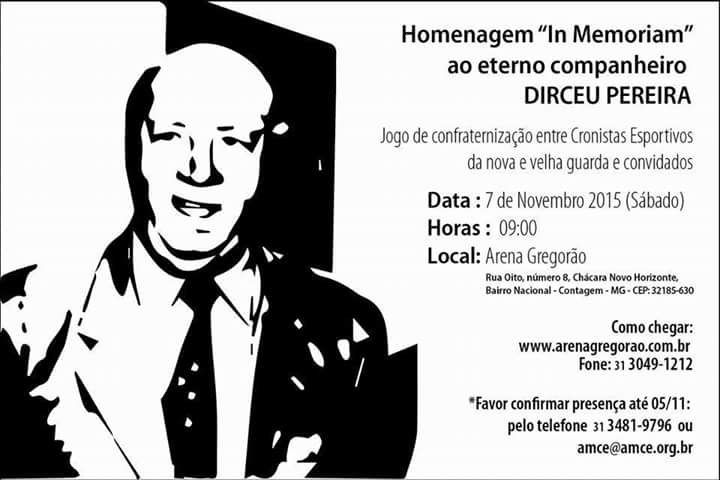 O jogo será realizado neste sábado (7), às 9h, na Arena Gregorão, no bairro Nacional, em Contagem. Jornalista, radialista e empresário, Dirceu foi era vice-presidente da Associação Mineira dos Cronistas Esportivos (Amce) e diretor da Administração de Estádios do Estado de Minas Gerais (Ademg).