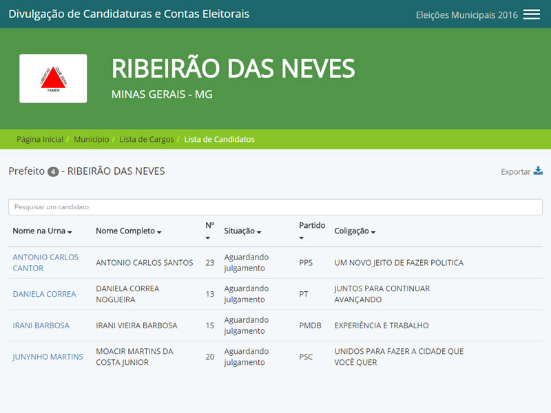As informações sobre Ribeirão das Neves finalmente foram disponibilizadas, nesta sexta-feira (19), no Sistema de Divulgação de Candidaturas e Contas Eleitorais (DivulgaCandContas), disponível no portal do Tribunal Superior Eleitoral (TSE), contendo os dados referentes aos registros de candidaturas para as eleições municipais de outubro.