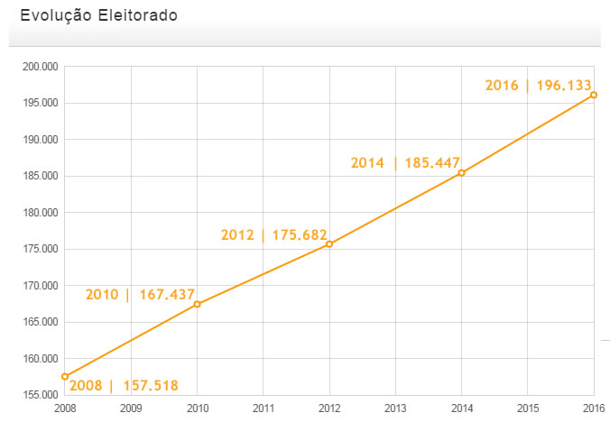 No que tange a faixa etária, as maiores concentrações de eleitores estão, além dos 25 a 29 anos com 11,95%, nas faixas de 35 a 39 (11,86%), 30 a 34 (11,75%) e 21 a 24 (10,47%), todas com mais de 20 mil eleitores cada. A menor concentração se dá na faixa entre 16 e 17 anos, cuja votação não é obrigatória, que soma 2.391 (1,22%) eleitores.