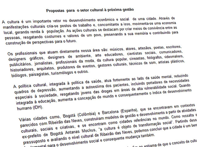 O texto traz consigo necessidades como a regulamentação do Fundo Municipal de Cultura e do Fundo Municipal de Patrimônio Cultural para financiamento de projetos da sociedade civil, investimento mínimo de 2% na área da cultura, fortalecimento da rede de enfrentamento a violência doméstica, criação de políticas para igualdade racial, programa de intercâmbio cultural para artistas e agentes culturais locais, a criação de um sistema setorial de Livro e Leitura, criação do calendário cultural de Ribeirão das Neves entre várias outras ações.