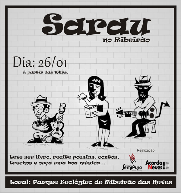 O Coletivo Semifusa e o grupo Acorda Neves realizam a quarta edição do Sarau no Ribeirão, no próximo dia 26, a partir das 18h, na Casa de Cultura. O projeto, que já integra a agenda cultural da cidade tem, como objetivo, a ocupação do espaço público, a disseminação e a reunião de autores, intérpretes e apreciadores da arte, conhecidos ou não.