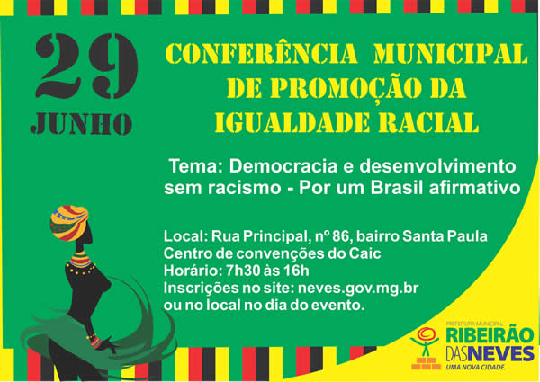 A Secretaria Municipal de Cultura realiza, neste sábado (29), a partir das 7h30, a I Conferência Municipal de Igualdade Racial. O tema da conferência será "Democracia e desenvolvimento sem racismo: por um Brasil afirmativo".
